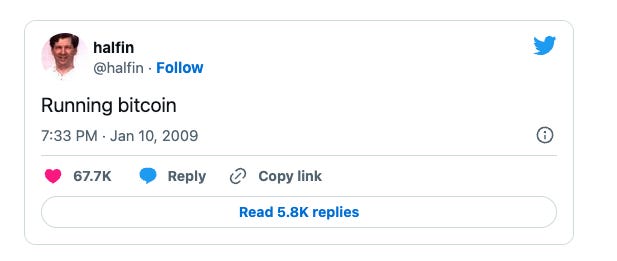 Hal famously received the first Bitcoin transaction from Satoshi, and is one of the first contributors to Bitcoin code. His first tweet simply said “Running bitcoin” and is now legendary in OG Bitcoin circles: