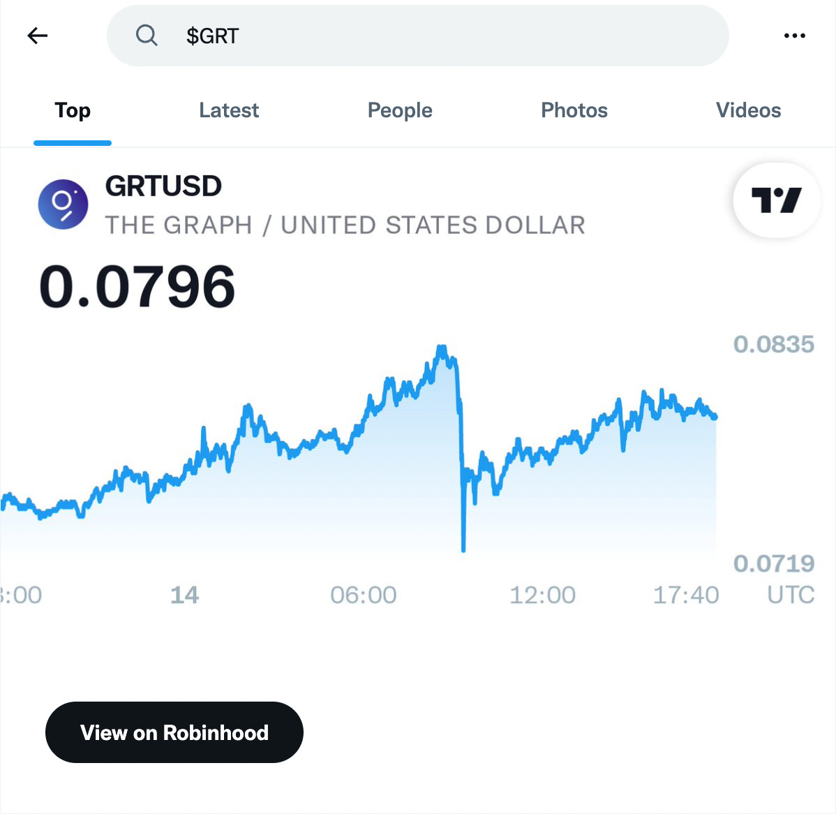 As an example, I ran a search for The Graph ($GRT) on Twitter web and was given a price chart for The Graph and a link leading to Robinhood.